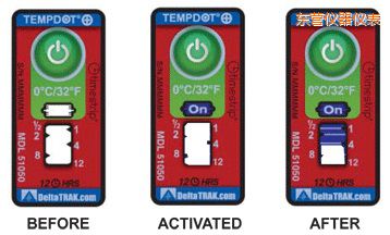 TempDot™Plus標(biāo)簽應(yīng)存儲在室溫下,并必須在反應(yīng)溫度閾值以上被激活。激活是通過用手指推壓。"On"字出現(xiàn)在第一個窗口中顯示激活。之后5分 鐘內(nèi),,在反應(yīng)溫度或低于反應(yīng)溫度的情況下將標(biāo)簽貼到產(chǎn)品上。藍色染料熔化并以控制的速率遷移,,經(jīng)過白色大窗口。這表示暴露在溫度閾值以上的累計時間。當(dāng)溫 度低于閾值時,該染料固化并停止移動。如果溫度超過閾值,TempDot®Plus標(biāo)簽提供即時的視覺跡象。