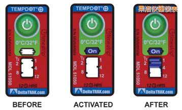 TempDot™Plus標簽應存儲在室溫下,,并必須在反應溫度閾值以上被激活。激活是通過用手指推壓。"On"字出現(xiàn)在第一個窗口中顯示激活。之后5分 鐘內(nèi),,在反應溫度或低于反應溫度的情況下將標簽貼到產(chǎn)品上。藍色染料熔化并以控制的速率遷移,,經(jīng)過白色大窗口。這表示暴露在溫度閾值以上的累計時間。當溫 度低于閾值時,,該染料固化并停止移動。如果溫度超過閾值,TempDot®Plus標簽提供即時的視覺跡象。