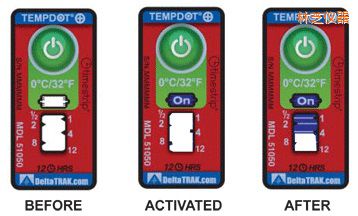 TempDot™Plus標(biāo)簽應(yīng)存儲(chǔ)在室溫下,并必須在反應(yīng)溫度閾值以上被激活。激活是通過(guò)用手指推壓。"On"字出現(xiàn)在第一個(gè)窗口中顯示激活。之后5分 鐘內(nèi),在反應(yīng)溫度或低于反應(yīng)溫度的情況下將標(biāo)簽貼到產(chǎn)品上。藍(lán)色染料熔化并以控制的速率遷移,,經(jīng)過(guò)白色大窗口。這表示暴露在溫度閾值以上的累計(jì)時(shí)間。當(dāng)溫 度低于閾值時(shí),該染料固化并停止移動(dòng)。如果溫度超過(guò)閾值,TempDot®Plus標(biāo)簽提供即時(shí)的視覺跡象。
