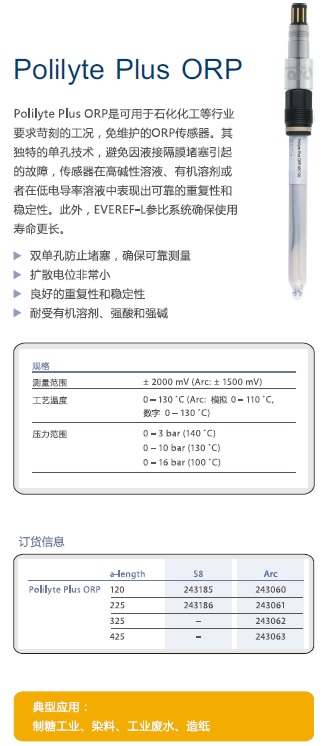 Polilyte Plus ORP是可用于石化化工等行業(yè)要求苛刻的工況,,免維護(hù)的ORP傳感器。其獨(dú)特的單孔技術(shù),,避免因液接隔膜堵塞引起的故障,,傳感器在高堿性溶液、有機(jī)溶劑或者在低電導(dǎo)率溶液中表現(xiàn)出可靠的重復(fù)性和穩(wěn)定性。此外,,EVEREF-L參比系統(tǒng)確保使用壽命更長。